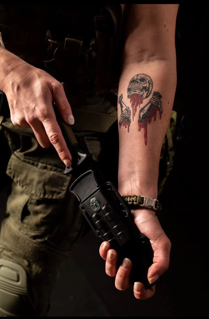 И, наконец, третья героиня сегодняшнего выпуска – Наталья Максимус, позывной «Волчья мать», военнослужащая спецназа «Ахмат». Посмотрите внимательно на тату . Её татуировка практически идентична работе «Ясыти» – визуально они почти совпадают. Сильный, узнаваемый образ, который у обеих читается одинаково: про воинский дух, силу и внутренний стержень.