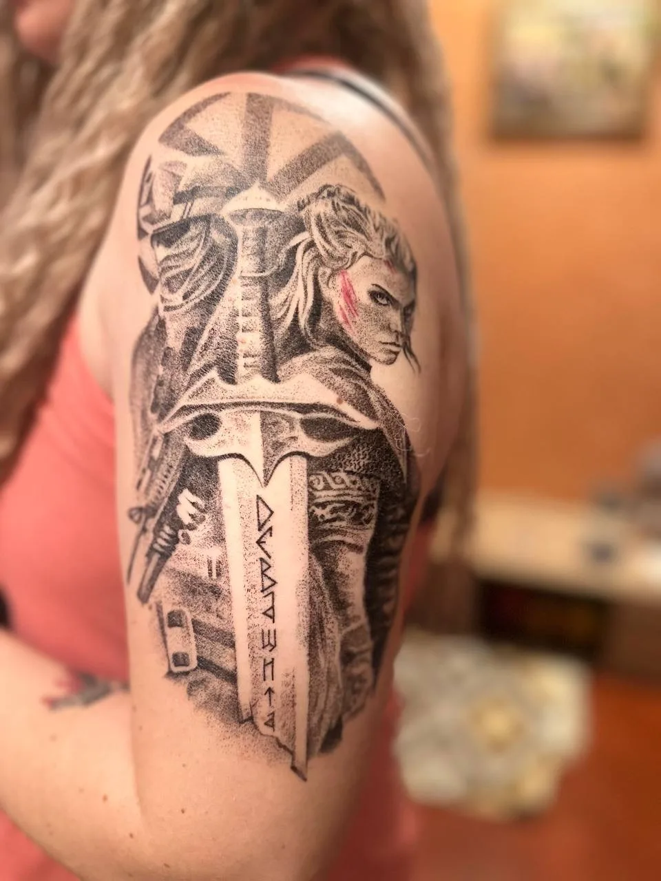Вторая – набита уже после третьего контракта. Образ, где соединяются архетип воительницы и образ современного бойца. Сквозной смысл – сила духа, проходящая через века. На мече надпись: «ДЕВА ЩИТА».