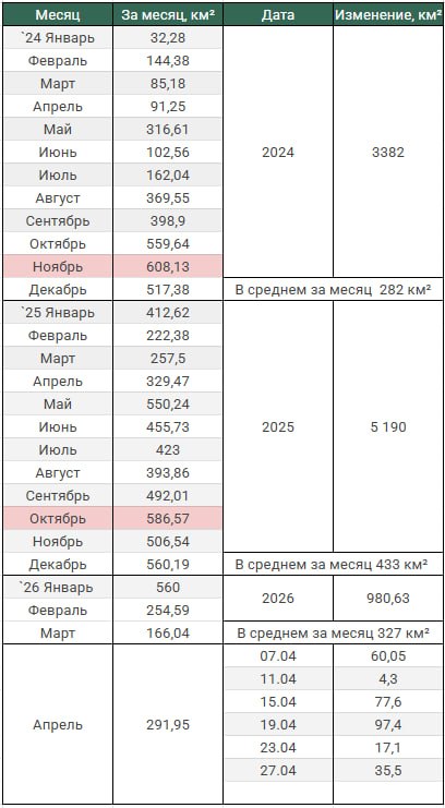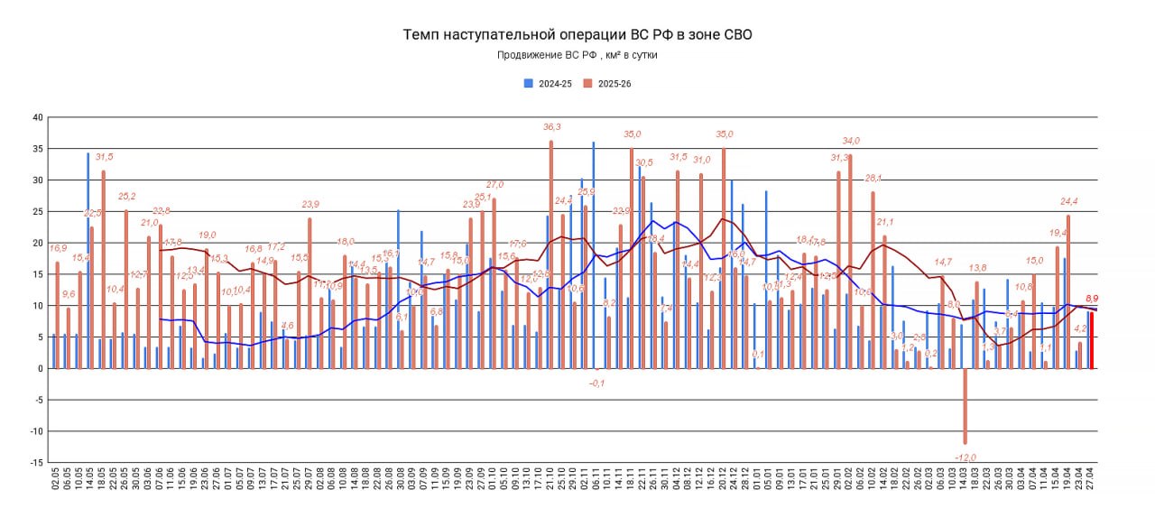 Обновление по данным c 23 по 26 апреля 2026. Темп продвижения +8,9 км в сутки за период, общее продвижение +35,5 км.