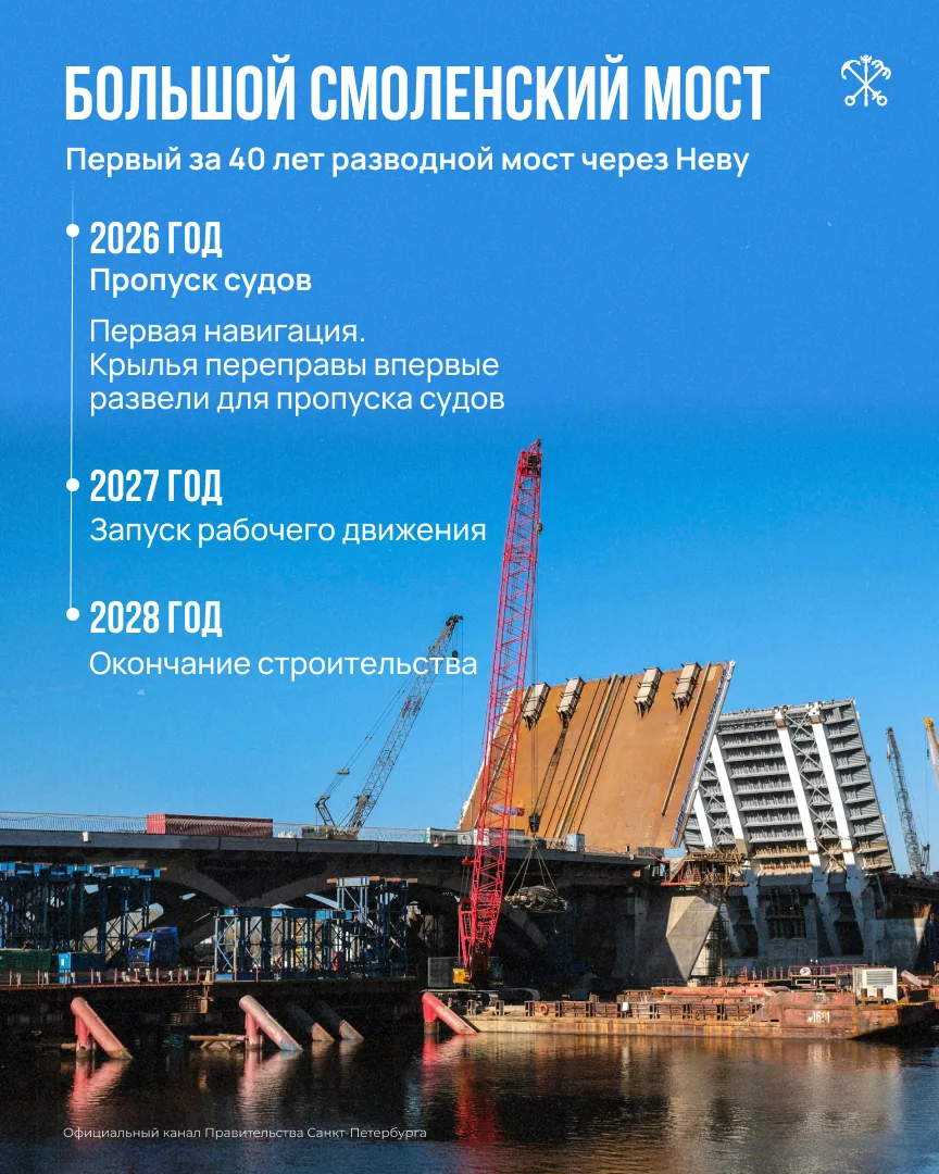 Большой Смоленский мост через Неву возводится с опережением графика между Володарским и мостом Александра Невского. Он станет частью автомагистрали в обход исторического центра. Уже сейчас переправу можно сводить и разводить по необходимости.