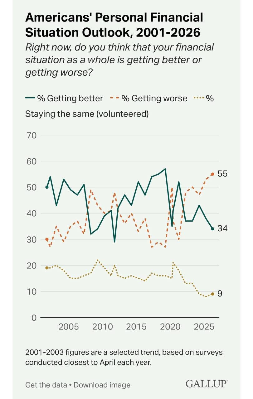 В последнем опросе Gallup сразу 55% американцев констатировали ухудшение своего финансового положения. Это антирекорд за 25 лет проведения замеров - даже в разгар финансового кризиса 2008 года было не так плохо. Американский электорат уже начинает лезть на стену из-за топливного кризиса и роста инфляции. Трамп же со своей иранской авантюрой оказывается буквально в безвыходном положении.