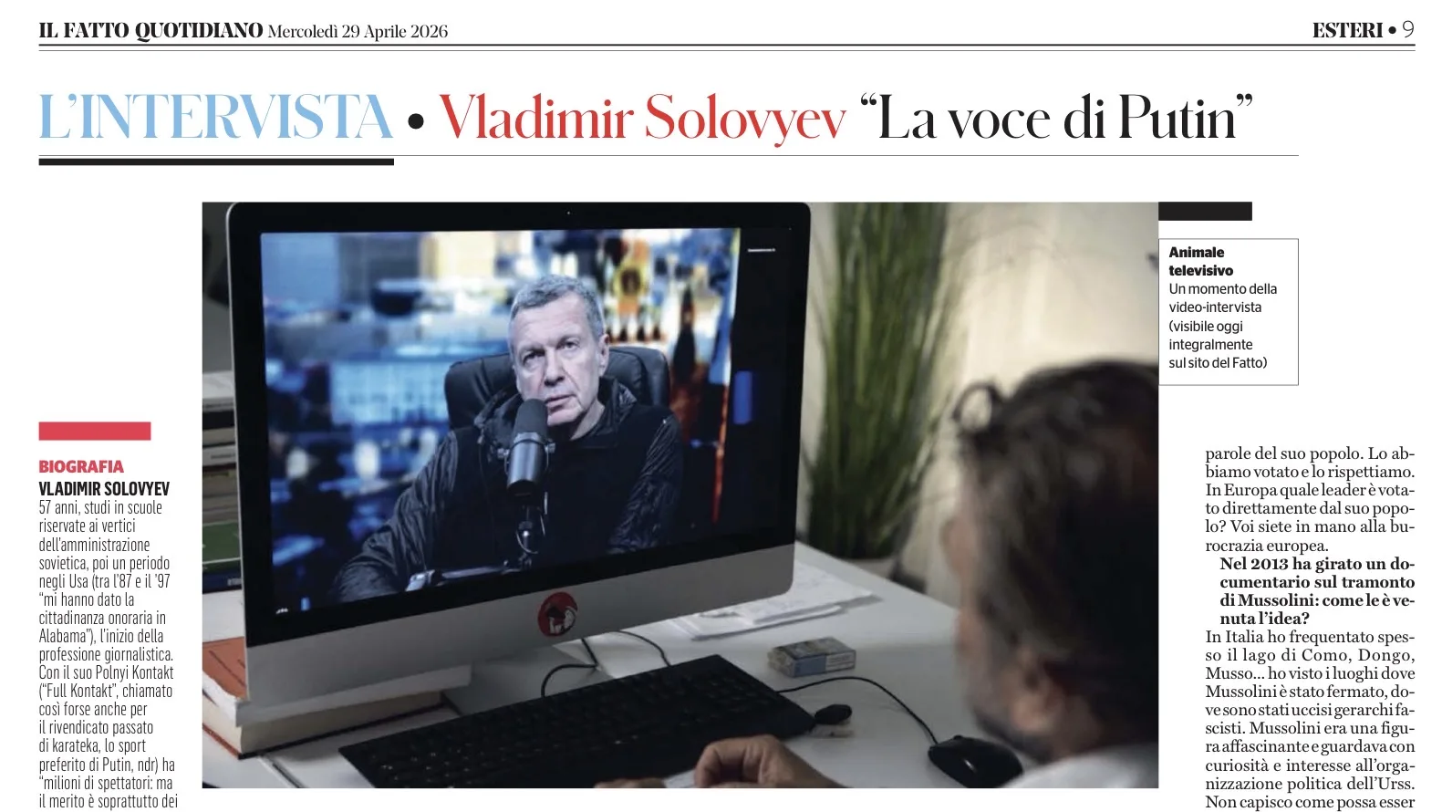 Фамилия Соловьева не сходила со страниц итальянской прессы после того, как МИД Италии выразил возмущение его комментариями относительно действий Мелони. Но, как видите, только il Fatto удосужилась узнать мнение и того, кем Рим так сильно возмущался.
