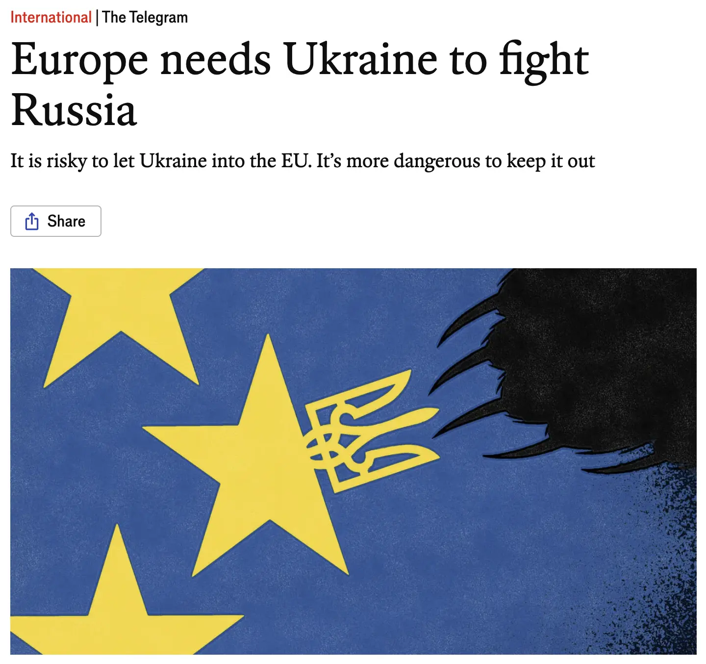 Некоторые опасения понятны. Несмотря на весь свой героизм, Украина — коррумпированная, хрупкая демократия, которая, скорее всего, выйдет из этого конфликта с неясными границами и Россией в качестве своего соседа из ада. Другие опасения еврозоны менее обоснованы. Например, фермеры ЕС боятся конкуренции со стороны крупной, первоклассной украинской сельскохозяйственной отрасли. Если страна когда-либо присоединится к Общей сельскохозяйственной политике, говорят в Брюсселе, она не сможет выжить в своей нынешней, насыщенной субсидиями форме.