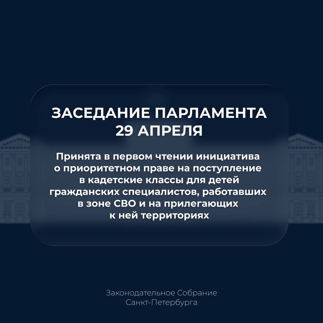 Парламент принял в первом чтении инициативу о приоритетном праве на поступление в кадетские классы для детей гражданских специалистов, работавших в зоне СВО и на прилегающих к ней территориях.