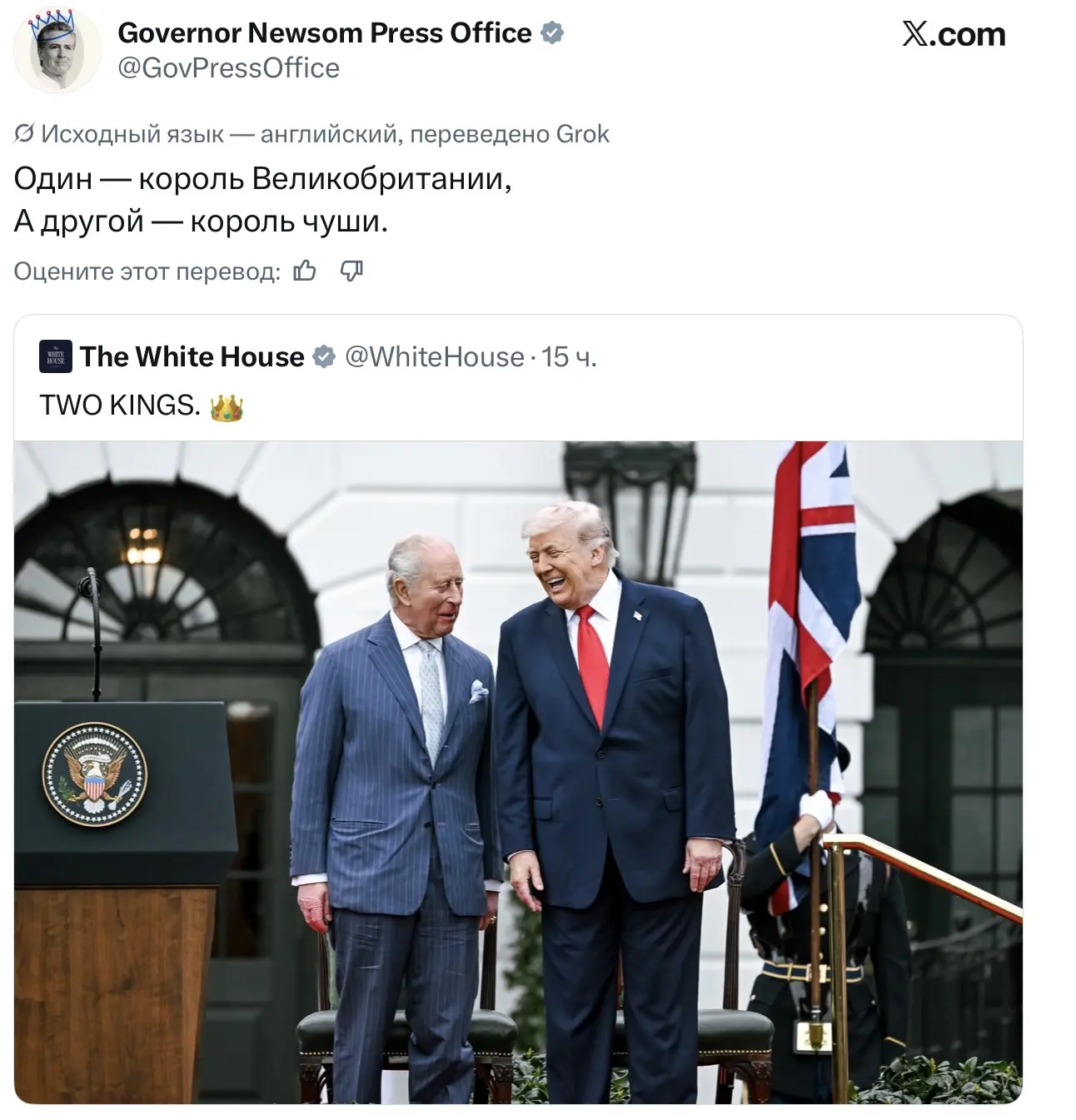 Владимир Корнилов: Губернатор Калифорнии Гэвин Ньюсом прокомментировал пост Белого дома о «двух королях»: «Один - король Великобритании