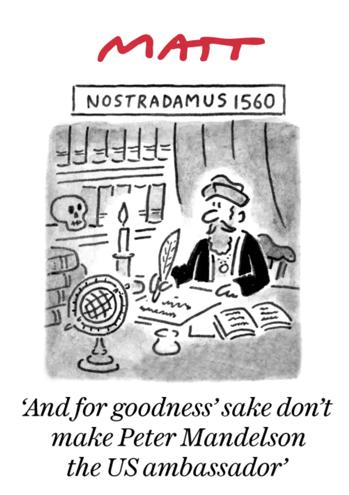 Видимо, вдохновленная историей о том, что Трамп и нынешний королек Британии Чарльз имели общих предков во времена Нострадамуса, газета The Daily Telegraph обнаружила еще один катрен из его предсказаний: «Ради всего святого не назначайте Питера Мендельсона послом в США».