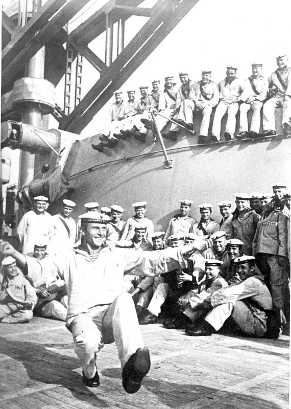 Фото: исполнение танца «Яблочко» на палубе линкора Балтийского флота «Октябрьская революция» (до 1925 года – «Гангут»)