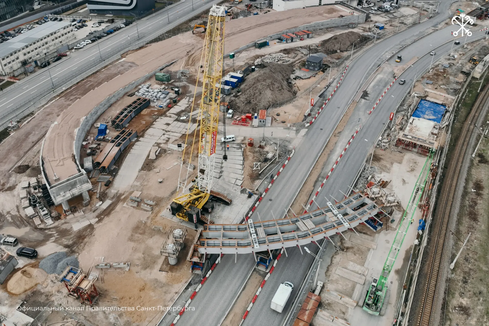 Специалисты сооружают будущую транспортную развязку в районе Лахта-центра. Они уже смонтировали первую стотонную балку пролётного строения путепровода над Приморским шоссе.