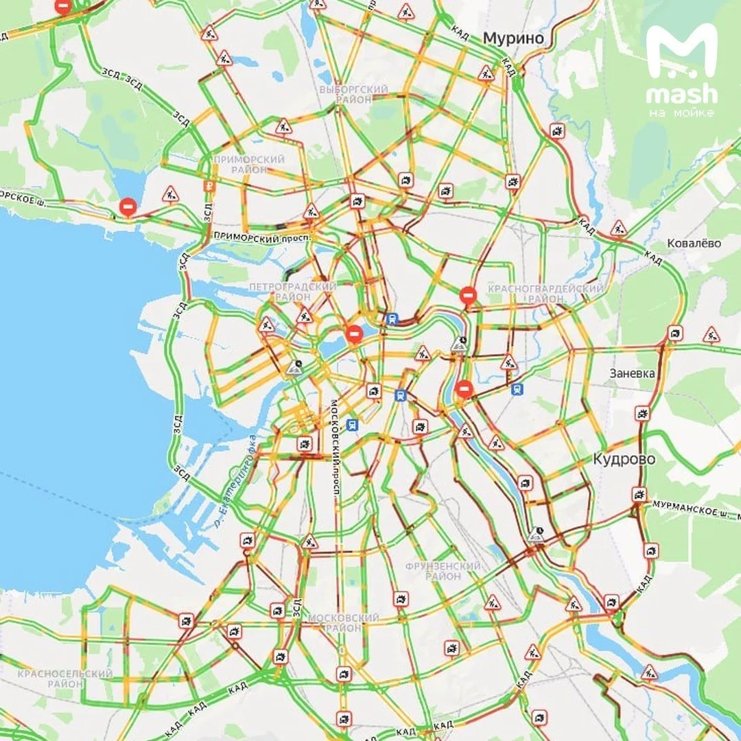 26 ДТП прямо сейчас в Питере — мегаполис сковали девятибалльные пробки перед длинными выходными.