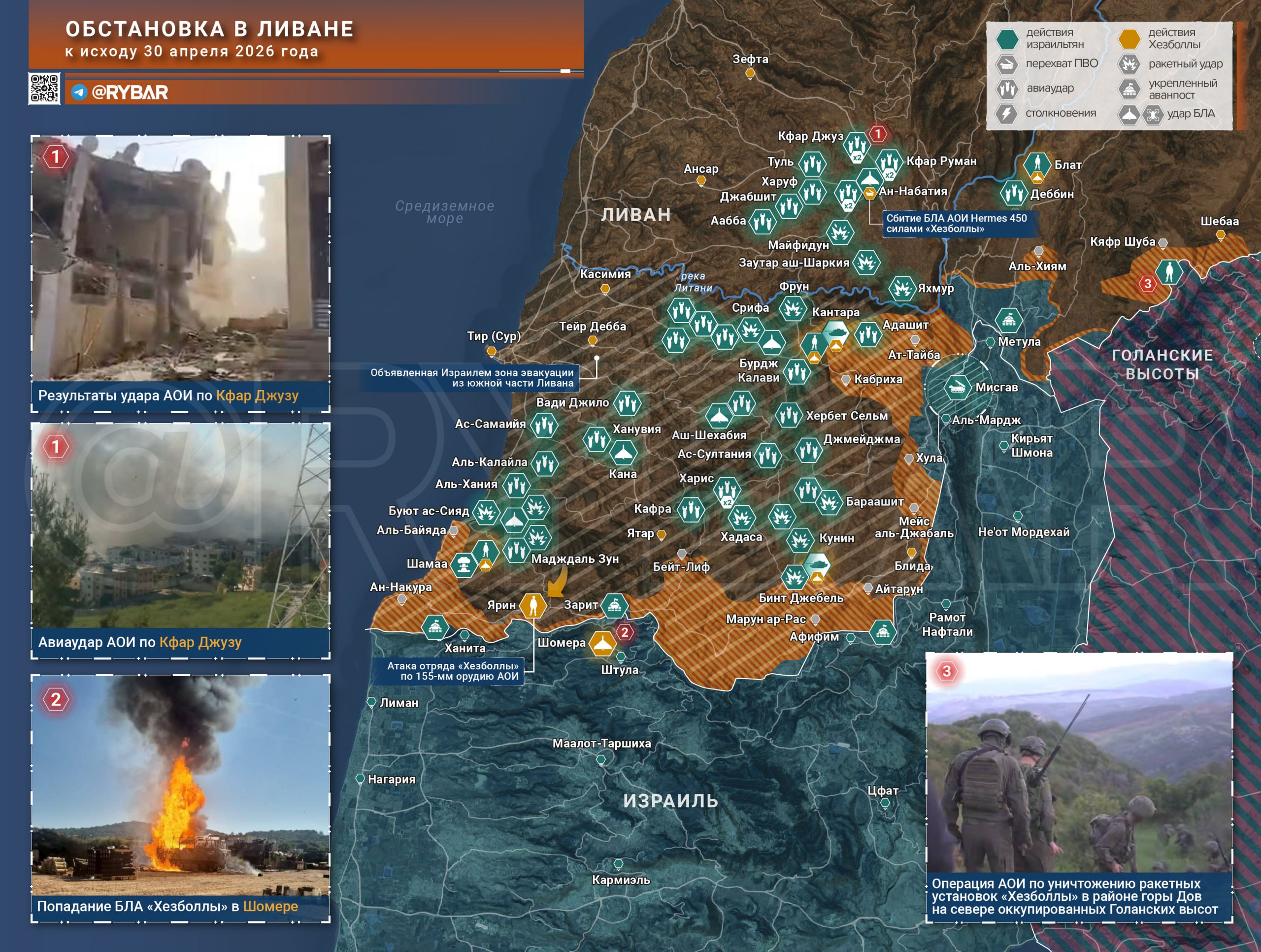 Ливанский фронт остается одной из ключевых зон нестабильности. Израильские силы продолжают интенсивные авиаудары по югу страны, включая районы севернее Литани, в то время как «Хезболла» заявляет об ударах по технике АОИ, уничтожении БЛА и локальных тактических успехах.