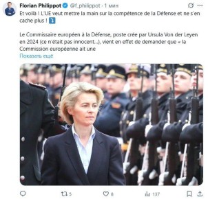 ‘ЕС хочет взять под контроль оборонный сектор и больше этого не скрывает! Европейский комиссар по обороне, должность которого была создана Урсулой фон дер Ляйен, только что потребовал, чтобы ‘Европейская комиссия имела полномочия...