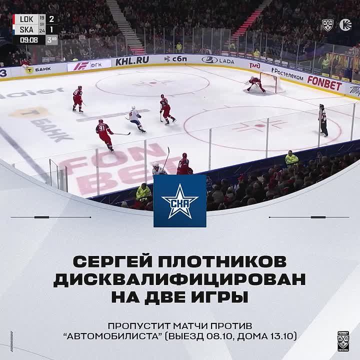Нападающий петербургского СКА Сергей Плотников дисквалифицирован на два матча КХЛ. Об этом сообщается на сайте лиги.Накануне 35-летний Плотников, капитан СКА, в третьем периоде встречи против ярославского «Локомотива» (2:4) получил матч-штраф за...
