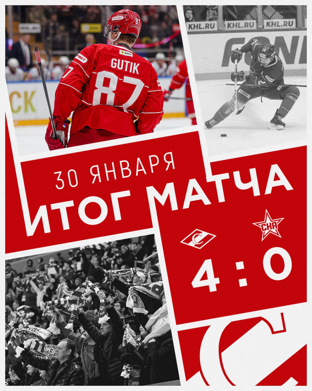 Московский «Спартак» обыграл петербургский СКА со счетом 4:0 в домашнем матче регулярного чемпионата «Фонбет» — КХЛ.