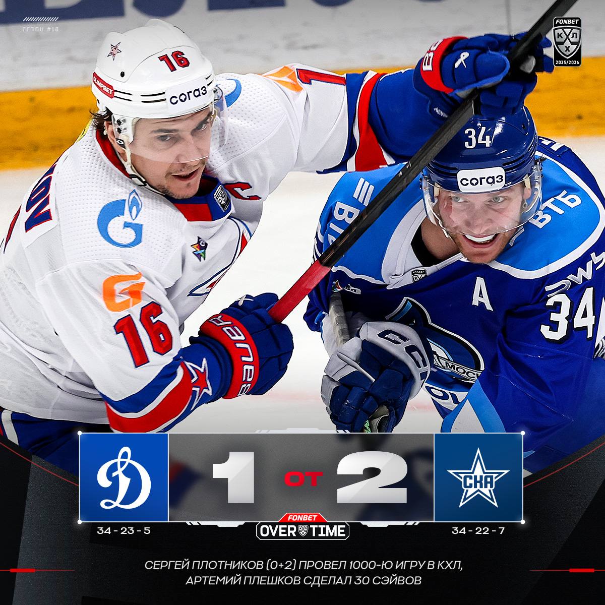 Московское «Динамо» уступило петербургскому СКА со счетом 1:2 в овертайме в домашнем матче регулярного чемпионата «Фонбет» — КХЛ.